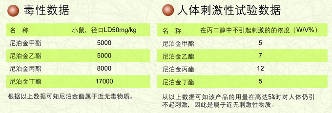 尼泊金脂的安全性能:(對(duì)羥基苯甲酸酯類的安全性能) 尼泊金酯類是國(guó)際公認(rèn)的較安全的防腐劑。在美國(guó),歐洲等國(guó)均允許使用于食品,由于它屬近乎無(wú)毒物質(zhì),用量少,在使用范圍內(nèi)不會(huì)對(duì)人體產(chǎn)生毒副作用。尼泊金酯類(對(duì)羥基苯甲酸酯類)安全評(píng)價(jià)數(shù)據(jù)如下: (毒性數(shù)據(jù)以及人體刺激性試驗(yàn)數(shù)據(jù))